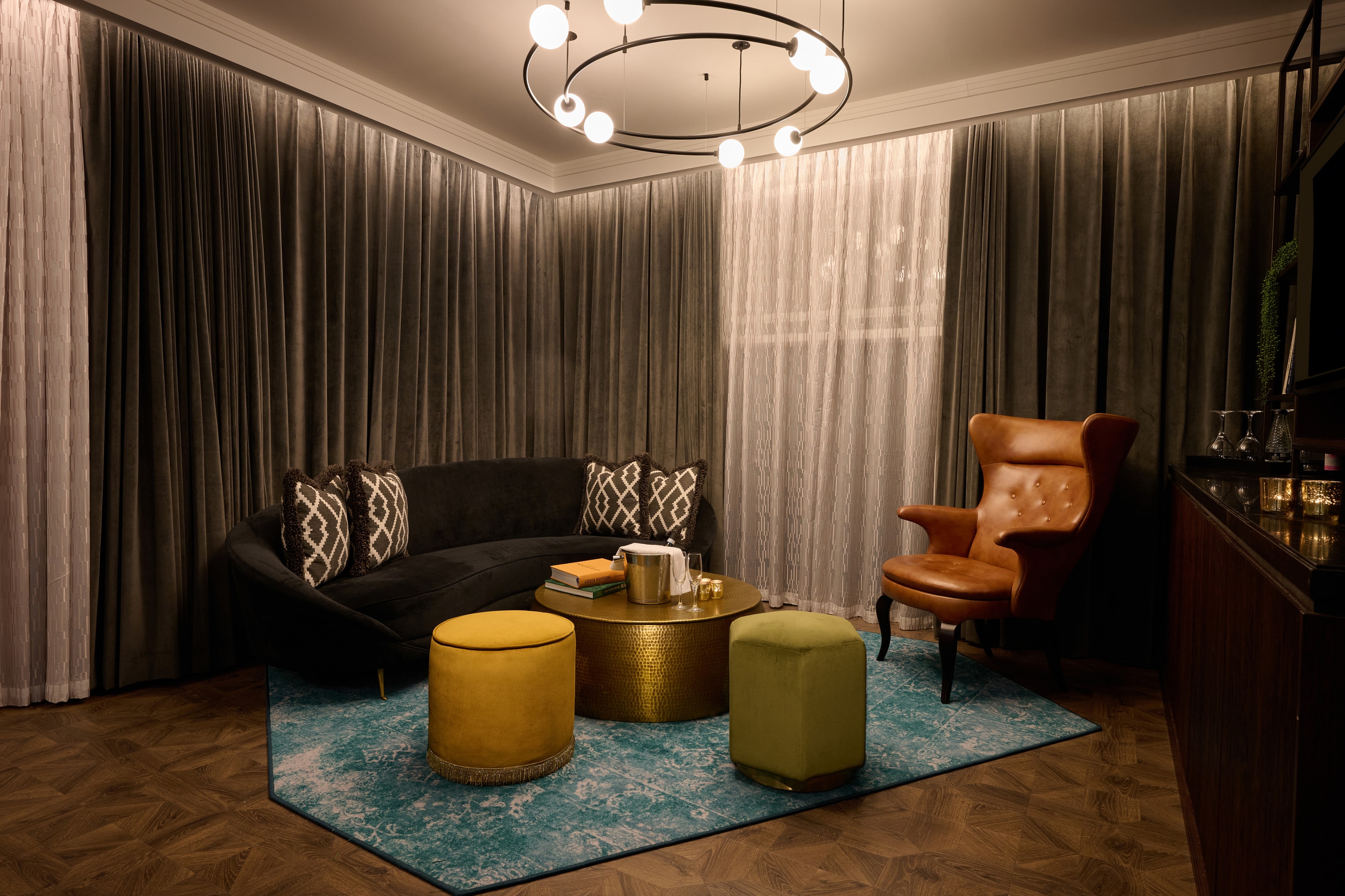 Add the neighbouring rooms and transform this suite into a decadent space for six.